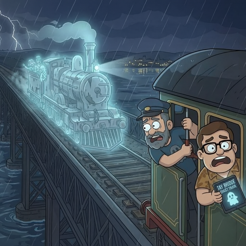 What begins as a simple journey across Scotland’s Tay Bridge quickly spirals into a transcontinental paranormal adventure. Steve and Dan, your intrepid Boo-Foons investigators, climb aboard a seemingly ordinary steam train, only to discover it’s anything but.