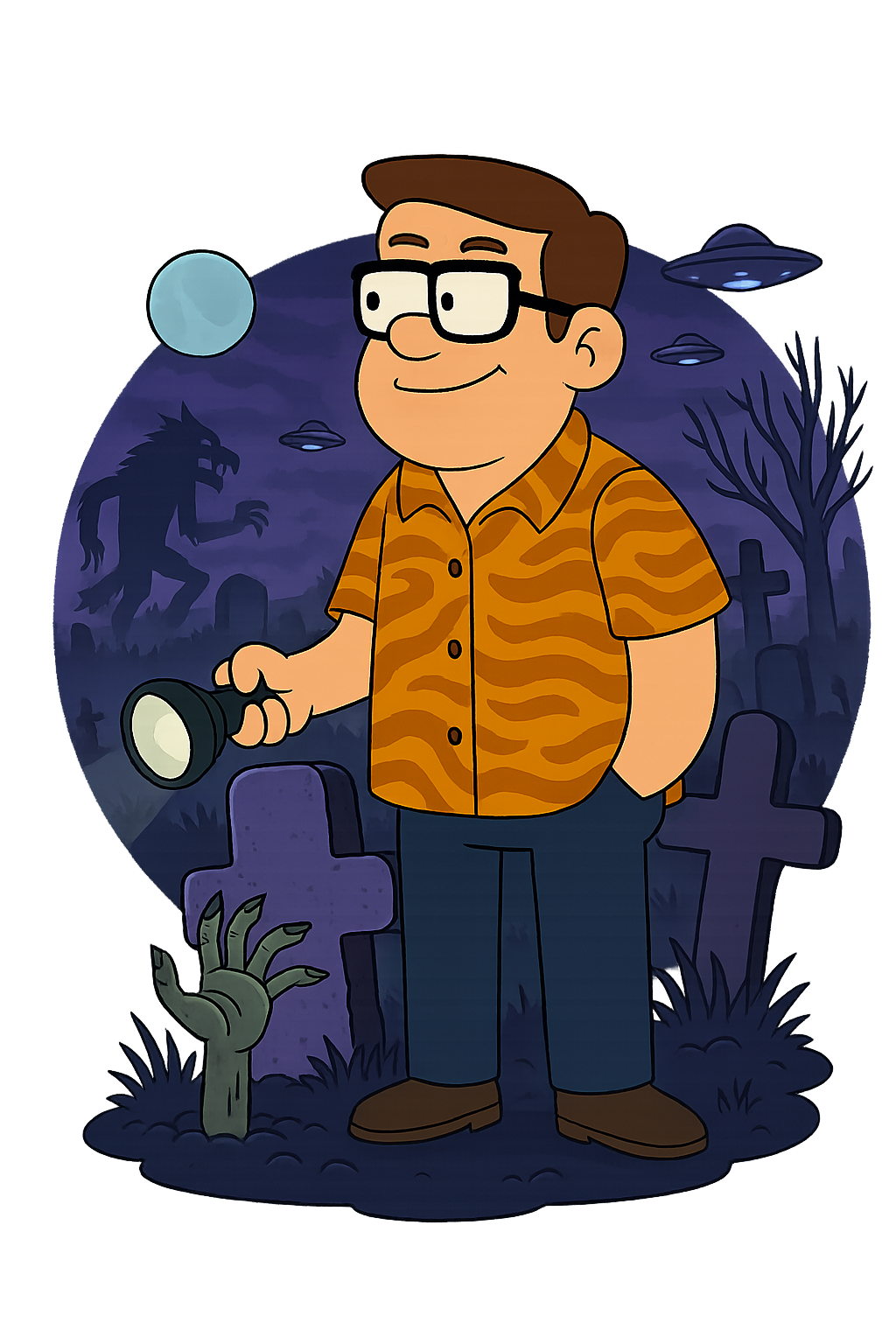 He’s the wildcard in the Boo-Foons duo, more likely to chase a weird idea than write it down, but always ready to riff, react, and roll with whatever haunted nonsense Dan throws his way. Whether it’s composing eerie tunes, reacting to folklore oddities, or just laughing at his own confusion, Steve’s the heart of the show’s playful spirit.