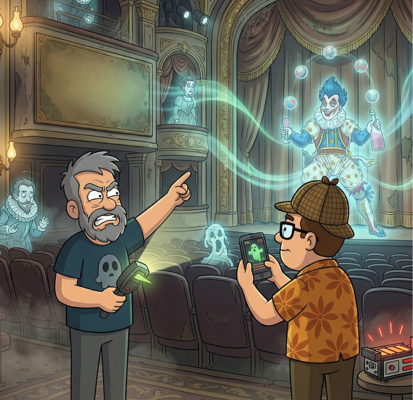 But tonight’s investigation has a special twist. Among the spectral cast is the ghost of one of Steve’s least favourite figures, Joseph Grimaldi, the original clown who turned slapstick into art. His painted grin is said to linger in the wings, and some swear they’ve heard his laughter echo through the stalls after midnight.