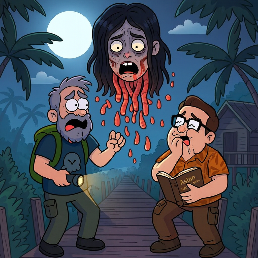 Armed with backpacks, questionable bravery, and a deeply flawed sense of what counts as a “relaxing getaway,” Steve and Dan set off across the region in search of the legendary Penanggalan or Krasue, beautiful women by day, terrifying flying viscera‑demons by night.